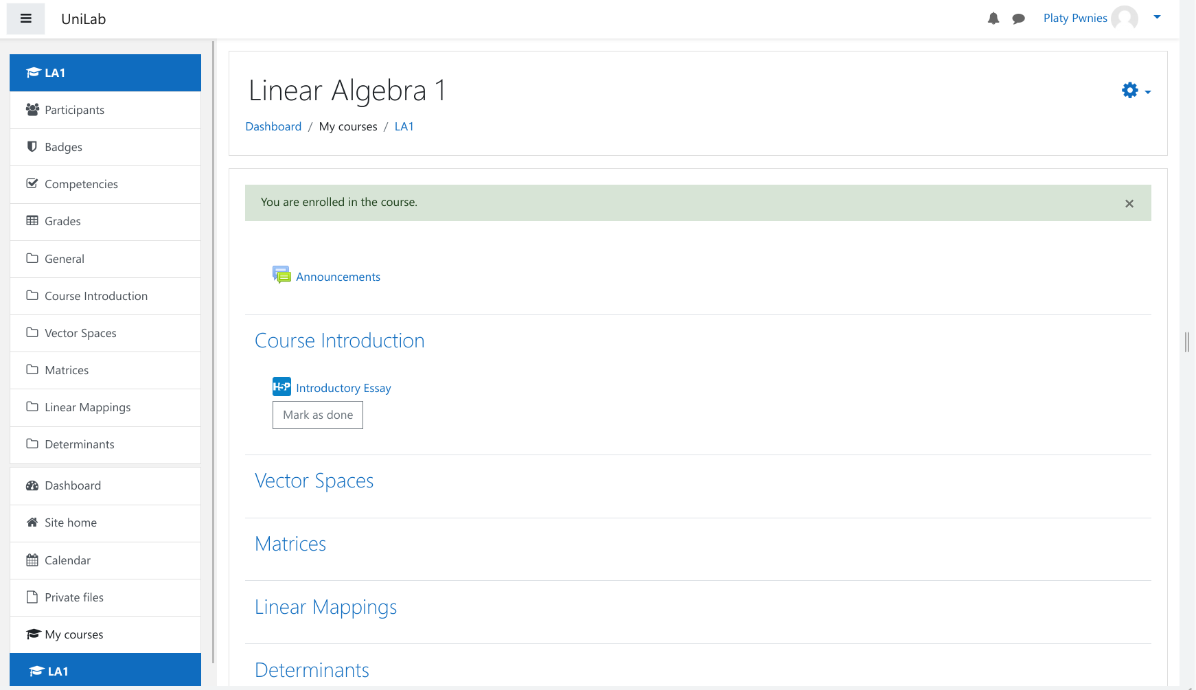 We register and enroll in the only course available, Linear Algebra 1: