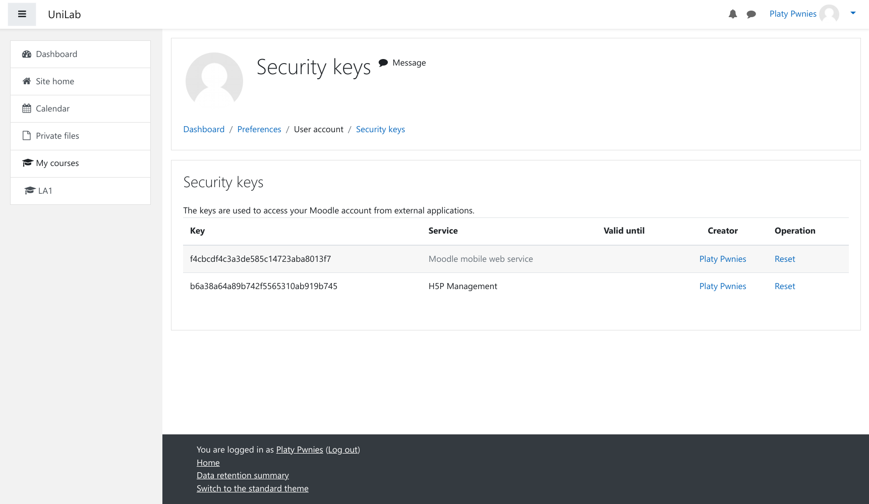 The vulnerable URL is http://moodle.unilab.htb/webservice/rest/server.php?wstoken=<token>&wsfunction=mod_h5pactivity_get_user_attempts&moodlewsrestformat=json&h5pactivityid=<id>&sortorder=<injectable>. We need a web services token for an exploit. Luckily, we find such a token for H5P management under Preferences > Security Keys: