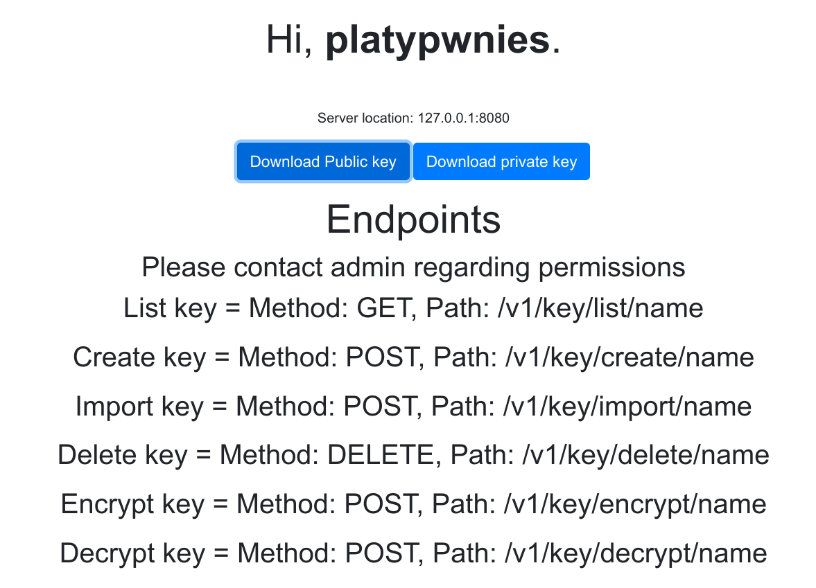 $ curl --key admin.key --cert admin.crt -k -X POST https://10.129.227.107:8080/v1/key/encrypt/test -d '{"plaintext": "helo"}'