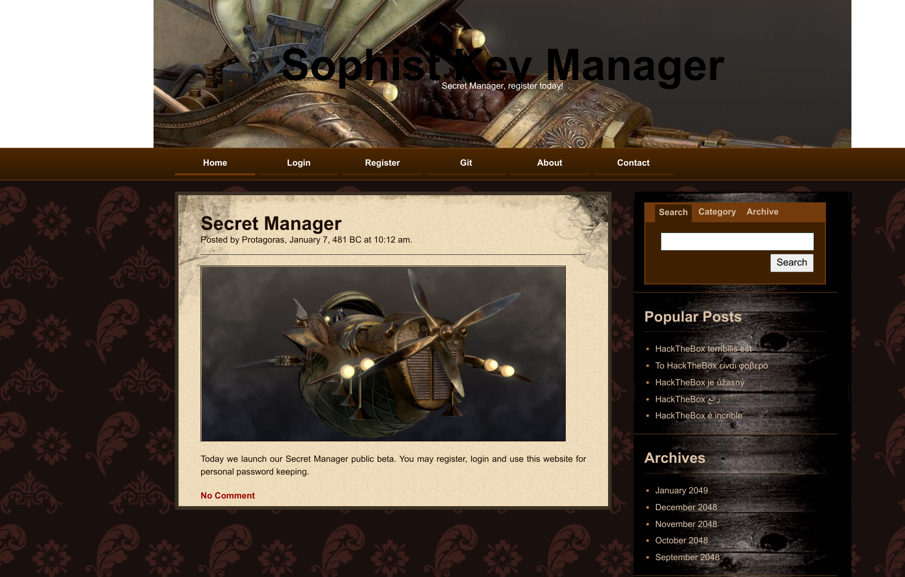 We first look at port 80 and are greeted with a website called “Sophist Key Manager):