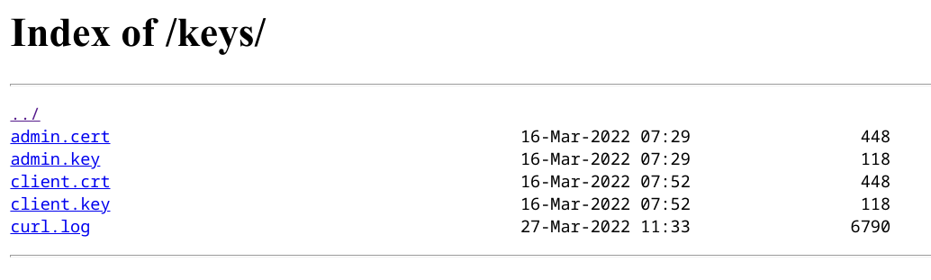 The download URLs point to /keys/client.key and /keys/client.crt respectively, so we try accessing /keys to see whether the webserver supports directory indexing: